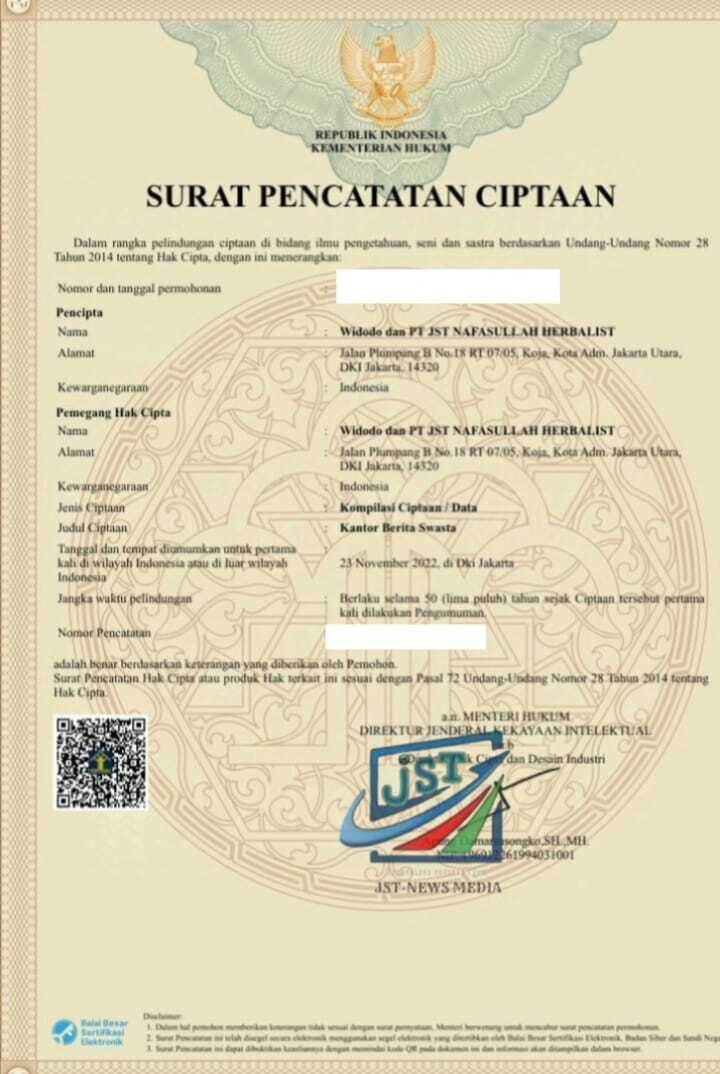 JST-NEWS MEDIA Didirikan pada wilayah daerah khusus Jakarta berdasarkan ketetapan SK.AHU-052553.AH.01.30.TH.2022 - NIB 2411220094586